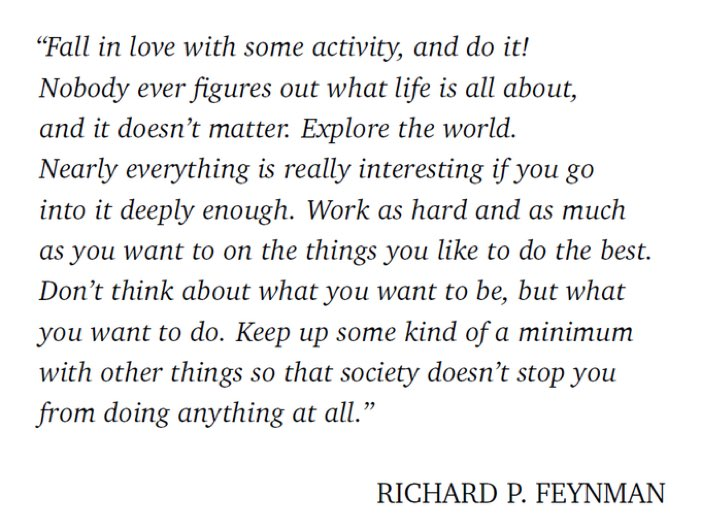 “Fall in love with some activity, and do it! Nobody ever figures out what life is all about, and it doesn't matter. Explore the world. Nearly everything is really interesting if you go into it deeply enough. Work as hard and as much as you want to on the things you like to do the best.”