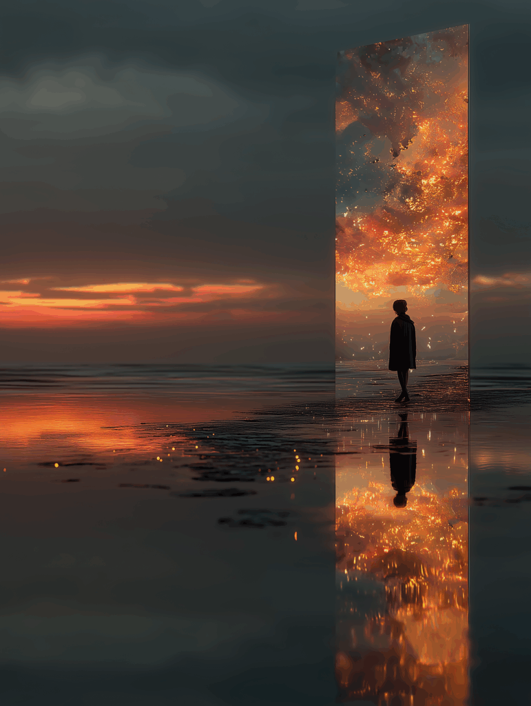 Vor uns ein Bild, das die uralte Frage der Menschheit in eine einzige Geste verdichtet: Eine Silhouette an der Schwelle zwischen zwei Welten. Links – die gedämpfte Dämmerung der bekannten Realität, sanft, melancholisch, vertraut in ihrer Resignation. Rechts – ein Kosmos aus Feuer und Licht, ein brennender Himmel voller Verheißungen und Gefahren, der die Seele ruft mit einer Stimme, die älter ist als alle Worte.