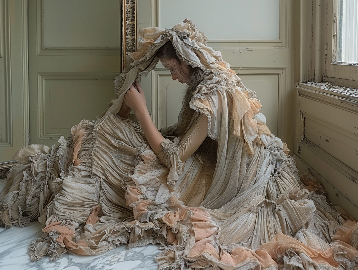 In einem leeren Raum, dessen Wände von den Narben der Zeit gezeichnet sind, sitzt eine Gestalt, umgeben von der Asche eines vergangenen Glanzes. Dies ist der Augenblick, in dem das Märchen von Aschenputtel in seine stille, ungeschminkte Wahrheit übergeht. Die Linse blickt nicht in ein Gesicht, das nach Erlösung sucht, sondern auf die Silhouette einer Seele, deren Kleid, einst eine Verheißung von Seide und Anmut, nun im Staub und in der Melancholie einer verlorenen Nacht zerfällt. Es ist ein Voyeur-Blick in die verlassenen Reste einer Geschichte, die nie stattfand.