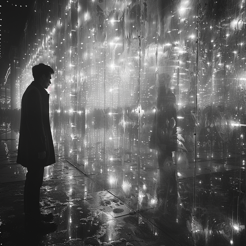 Diese cinematische Schwarz-Weiß-Vision wird zur Meditation über die Poesie der urbanen Schattenwelten. Die Silhouette vor den regennassen Fenstern, umhüllt von den tausend Lichtern der nie schlafenden Metropole, verkörpert jene universelle Erfahrung des modernen Menschen: dass wir inmitten all der scheinbar dunklen Räume der Nacht in der Stadt einen magischen leuchten Glanz entdecken können. Die Regentropfen auf dem Glas werden zu Spiegelung der Stadt selbst – jeder Tropfen ein anderer Traum, jede Reflexion ein Versprechen an die Nacht.