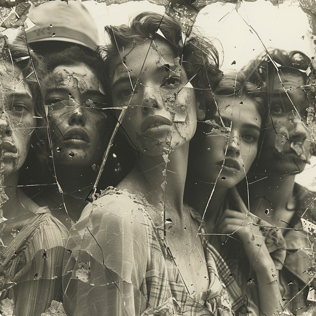 Die Linse blickt nicht in ein Gesicht, sondern in die kollektive Tragödie jener Seelen, deren Gestalten in den splitternden Brüchen des Zeitgeistes zersplittert sind – ein Abbild der inneren Krise, die zwischen den Zeilen der fluiden Identität und der starren Perfektion tanzt. Die Haut, gezeichnet von den feinen Spuren des Kummers und des Schmutzes der Welt, ist zu einem Mosaik der Zerbrechlichkeit geworden. Die Gesichter, eine Prozession der Gleichheit, sind gefangen im Schönheitswahn und in der Suche nach einer Identität, die nicht aus dem wahren Kern ihrer Seele, sondern aus dem Abglanz äußerer Ideale geboren ist. Dieses Bild ist eine schmerzhafte, aber notwendige Konfrontation mit der Leere, die sich hinter der makellosen Maske der Anmut verbirgt.