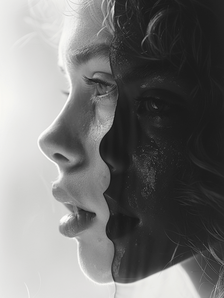 Diese intime Schwarz-Weiß-Maske wird zur brutalen Bürde des Erkennens. Das zarte Profil, durchzogen von den feinen Linien der Erfahrung, verkörpert jene stille Resignation, die entsteht, wenn wir zu viel verstehen und zu wenig verändern können. Jede Wimper wird zum Gitter eines unsichtbaren Gefängnisses, jede Pore der Haut zur Landkarte einer Seele, die ihre eigenen Grenzen zu gut kennt.