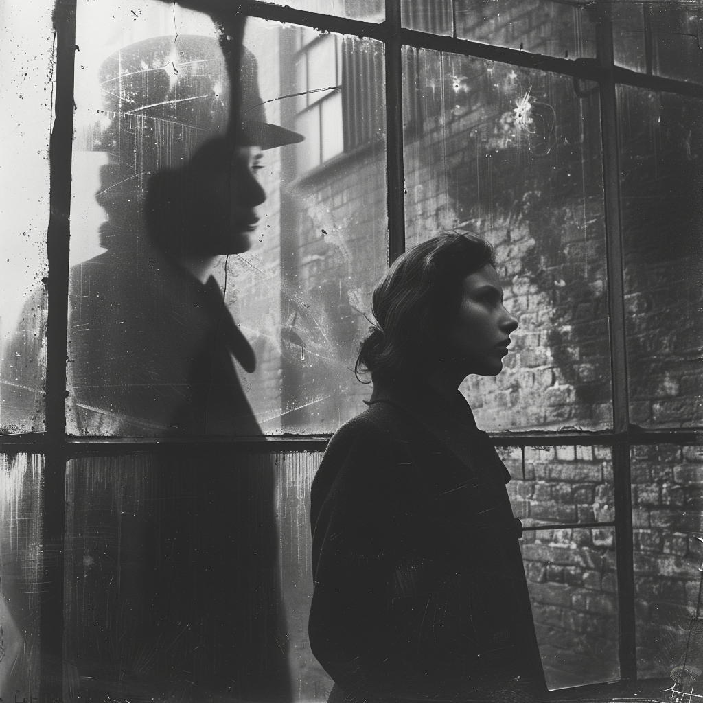 Doch der eigentliche Fokus liegt nicht in der Präsenz der Frau, sondern in der schattenhaften, fast geisterhaften Gestalt, die sich links von ihr, als eine zweite, unscharfe Realität, in der Scheibe spiegelt. Diese Silhouette, deren stummer, unergründlicher Blick sich an den der Frau heftet, ist die Silhouette – ein Phantom der Erinnerung, ein verletzter Teil der Vergangenheit oder die innere, schattenhafte Seite ihrer eigenen Seele. Die Komposition ist ein meisterhaftes Spiel mit der Ambivalenz: Das Spiegelbild zeigt uns, was wir nicht sehen, enthüllt eine verborgene Wahrheit, die die gesamte Erzählung auf den Kopf stellt.