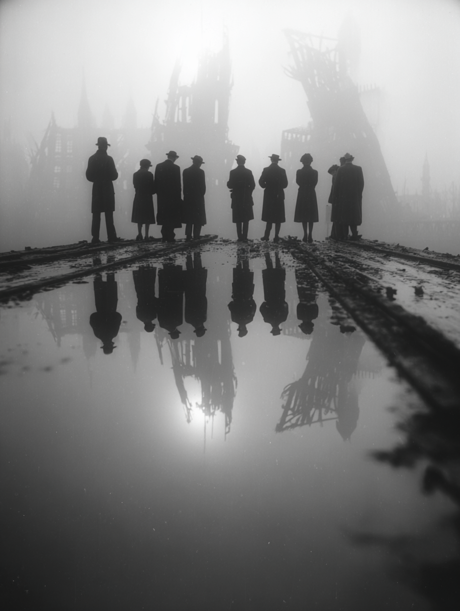Dies ist der Augenblick, in dem das kollektive Herz im Angesicht seines eigenen Endes zerbricht. Fall of a Nation ist die unbarmherzige Fortsetzung der Erzählung, der Moment, in dem die erhabenen Türme des Irrglaubens zu Skeletten des Verfalls werden. Die Linse blickt nicht in eine Welt, die sich erhebt, sondern auf das scharfe, grelle Licht eines Untergangs, das die schmerzhafte Wahrheit des Scheiterns entblößt. Seht her, die schweigende Prozession von Gestalten, die nun in den Trümmern des Mammon stehen, gezeichnet von den feinen Spuren des Kummers und des Schmutzes der Welt. Die Türme, einst ein Symbol der Macht und der Hoffnung, sind nun zerborstene Gerippe, die uns daran erinnern, dass die größte Schönheit oft in den rauesten Abgründen geboren wird. Und im Spiegel des Wassers, das in seiner dunklen Kargheit das Chaos reflektiert, finden wir den tiefsten Akt der Offenbarung. Ein gleißender, übernatürlicher Schein, ein Licht, das wie ein unbarmherziger Scheinwerfer die zerborstenen Skelette einer Nation enthüllt.