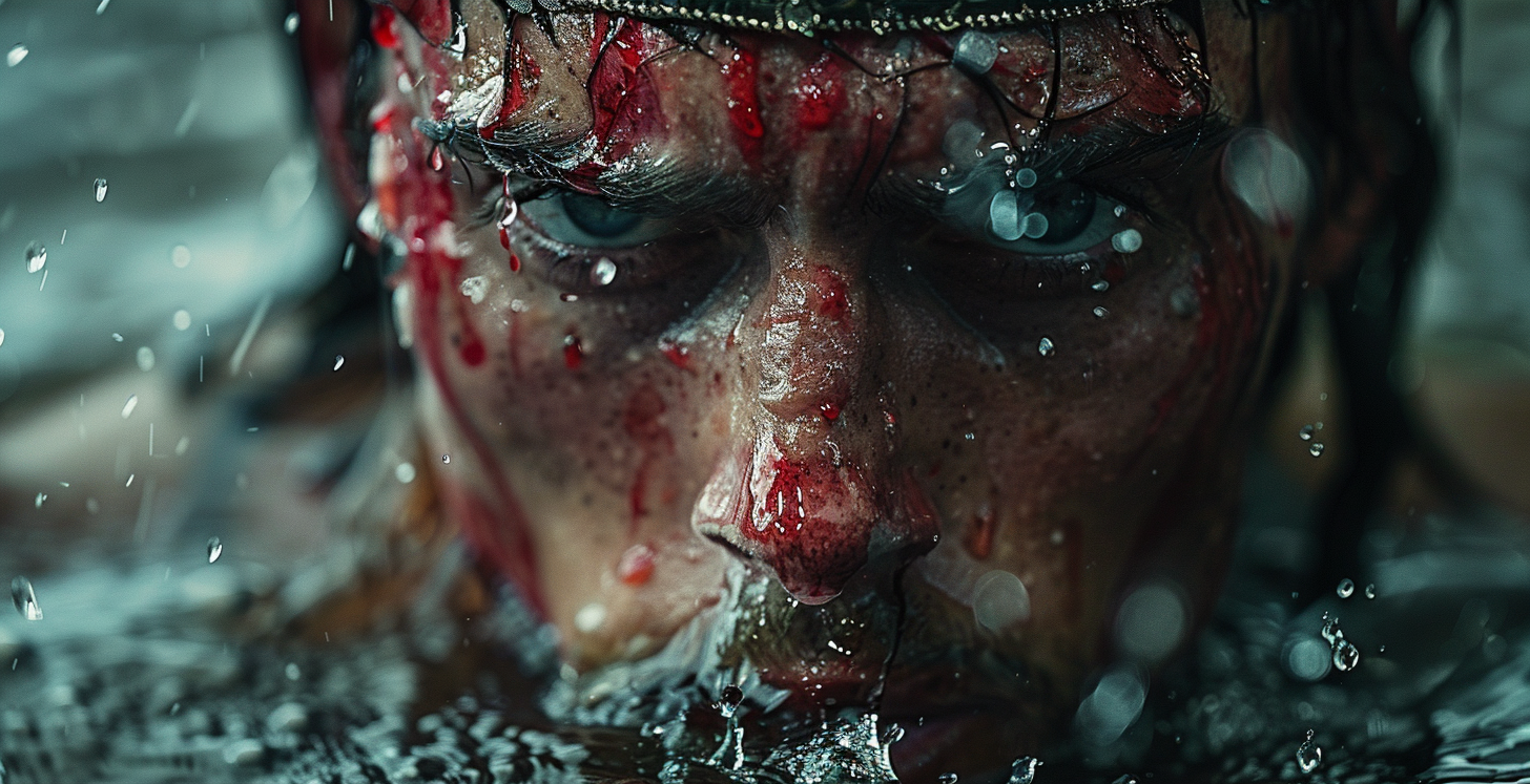 Die Linse richtet sich gnadenlos auf das Antlitz, um in den Augen nicht den Stolz, sondern die schmerzhafte Erkenntnis des Scheiterns zu finden. Das Wasser, das das Gesicht umspült, ist nicht nur Element, sondern ein gnadenloser Spiegel des Schicksals selbst, das die vergängliche Fassade der Macht hinwegwäscht. Die rote Spur auf der Stirn ist keine Dekoration, sondern das sichtbare Zeugnis eines inneren Kampfes, der bis zum letzten Atemzug geführt wird.