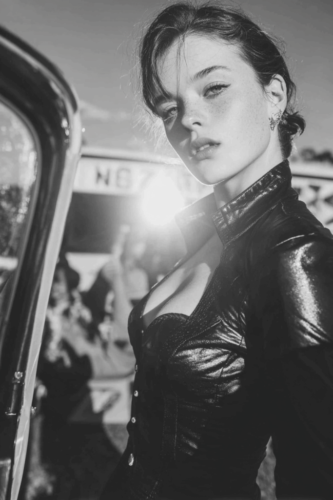 Seht her. Dies ist nicht das Bild der Schönheit, die sich im Glanz sonnt. Es ist eine Konfrontation. Ein Antlitz, ins Licht gedrängt. Ein Blick, der keine Frage duldet. Der Körper, fest und stählern im Leder, hat seinen Platz gefunden. Ein Blick, der sich nicht in einem Spiegel verliert, sondern den Spiegel selbst herausfordert.