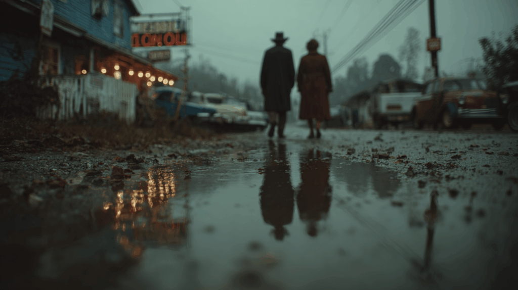 Die Linse blickt nicht in Gesichter, sondern auf die erhabene Silhouette zweier Gestalten, die als ein einziges, im unversehrten Monument durch die schlammigen, irdenen Straßen einer vergessenen Welt schreiten. Jeder Schritt, den sie tun, ist ein Flüstern der Erinnerung des Weges, den sie gemeinsam beschritten haben. Die Reflexion, die sie im Spiegel des Wassers werfen, ist nicht mehr makellos wie in den Tagen ihrer Jugend, sondern eine zerbrochene, geisterhafte Vision einer Welt, die einmal war.
