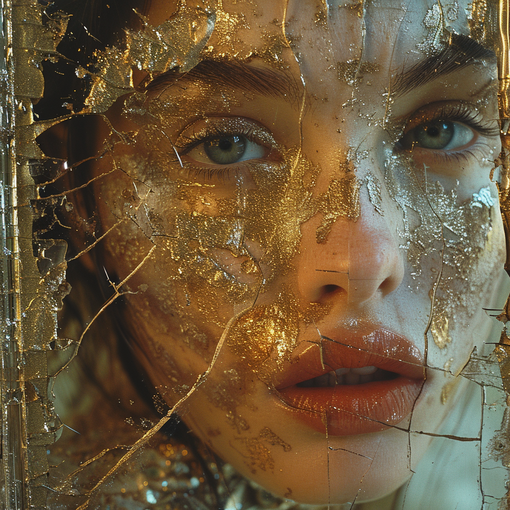 Seht her, das Antlitz. Es ist nicht von der Welt, sondern von den Dingen, die größer sind als die Welt, gezeichnet. Die Linien, die das Gesicht zerschneiden, sind nicht Brüche, sondern Pfade, auf denen das göttliche Licht tanzt. Und das Gold, das auf der Haut wie Sternenstaub leuchtet, ist nicht die Eitelkeit, die in der Welt gesucht wird, sondern das unvergängliche, innere Funkeln, das erst sichtbar wird, wenn die äußere Hülle in Scherben liegt. Denn „Wenn das Spiegelbild des Herzens stumpf ist, wurde der Rost nicht von seinem Gesicht entfernt“. Der Rost ist das Ego, das das wahre Gesicht der Seele verbirgt. Dieses Bild ist der Moment, in dem die Seele, schmerzhaft, aber notwendig, ihre wahre Gestalt zu erblicken wagt.