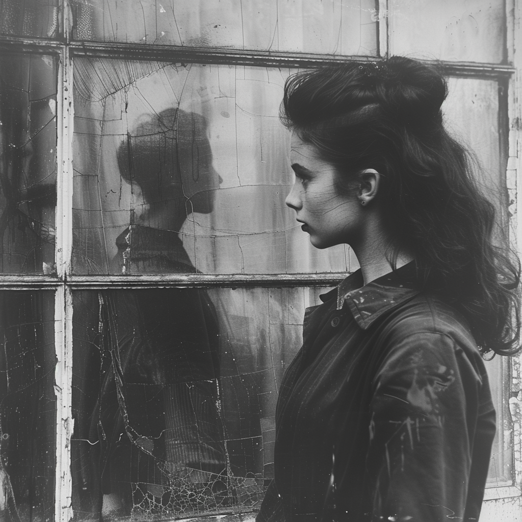 Diese melancholische Schwarz-Weiß-Komposition wird zur Momentaufnahme über die Vielschichtigkeit der Identität. Das Profil der Frau, die durch das rissige Fenster auf ihr gespiegeltes Selbst blickt, verkörpert jene universelle Erfahrung der Selbstreflexion, wo wir erkennen, dass wir nicht eine, sondern viele sind – die, die wir der Welt zeigen, die, die wir im Stillen sind, und die unzähligen anderen Versionen unserer selbst, die in den Rissen der Zeit verborgen liegen.