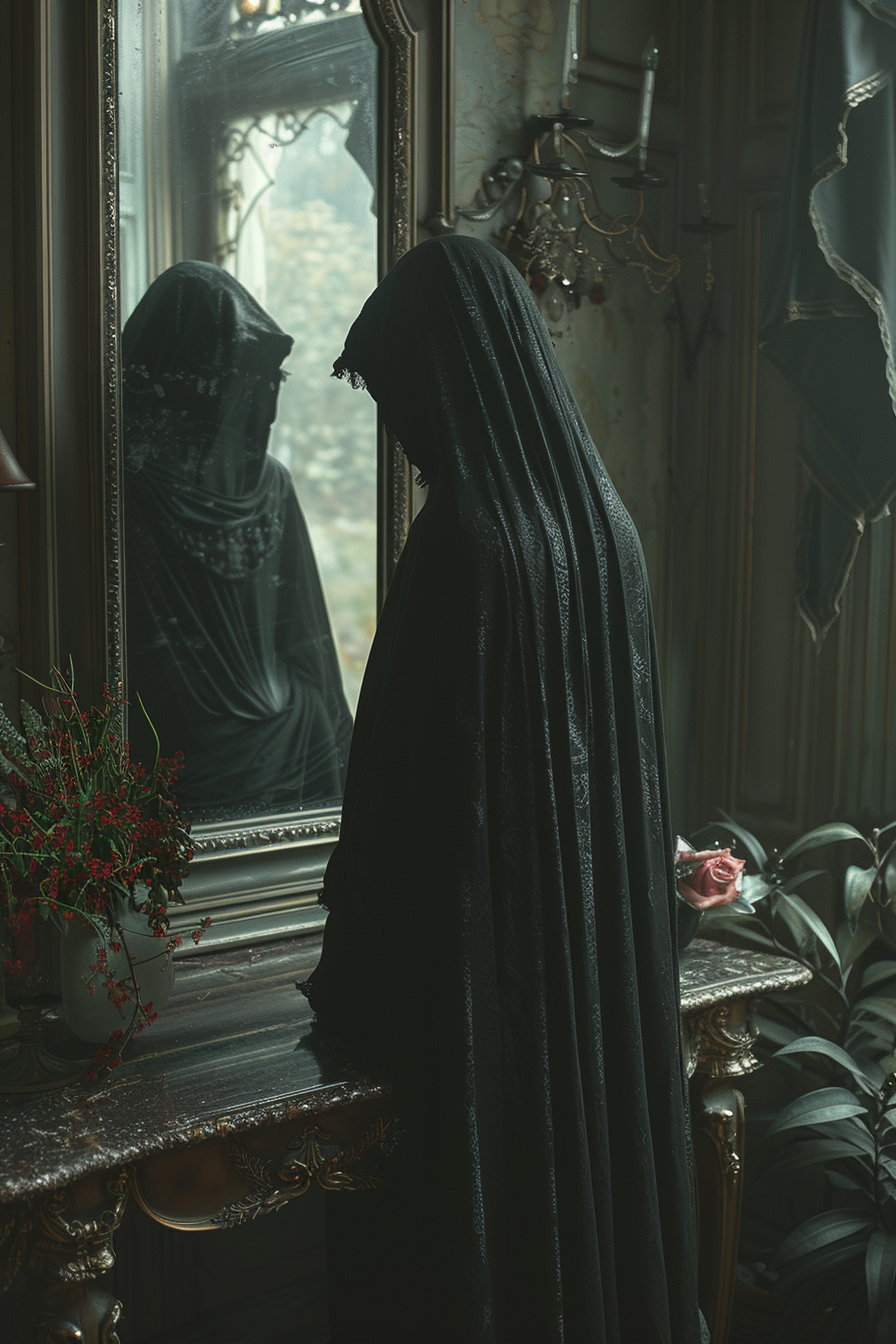Dies ist der Augenblick, in dem das Selbst im staubigen Winkel eines vergessenen Raumes nach seinem verlorenen Echo sucht. Das Le Portrait Imparfait ist kein Abbild, sondern eine schmerzhafte Metaphysik des Zerfalls, in der die Maske und das Antlitz eins geworden sind. Die Gestalt, gehüllt in ein Gewand, das so schwarz ist wie die Nacht, kehrt der Welt den Rücken zu und blickt in einen Spiegel, dessen Rahmen aus alternden, goldenen Geschichten besteht. Doch die Reflexion, die ihm entgegenblickt, ist kein treues Abbild. Sie ist ein unvollkommenes Phantom, eine zerbrechliche Vision des Ichs, das nicht mehr ist.
