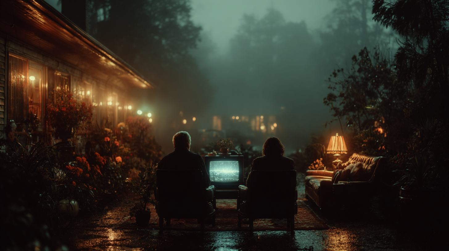 Dies ist nicht das Bild der Ruhe in Harmonie, umgeben von einer schönen, friedvollen Kulisse. Es ist ein Appell, an unser aller Selbst, das im sanften, tückischen Glanz eines flimmernden Schattens versinkt. Living Room ist kein Raum des Miteinanders, sondern eine Metaphysik der Entfremdung, eine schmerzhafte Ironie, die uns lehrt, dass wir die Seele unserer eigenen Existenz gegen das erhabene Nichts der Illusion eintauschen. Die Linse blickt nicht in Gesichter, sondern auf zwei Rücken, die wie Monumente der Kapitulation im Dunst einer verlorenen Welt verharren. Sie sind die leeren Hülsen, die stummen Sklaven einer unsichtbaren Macht, die uns unsere Zeit und unser Bewusstsein stiehlt.