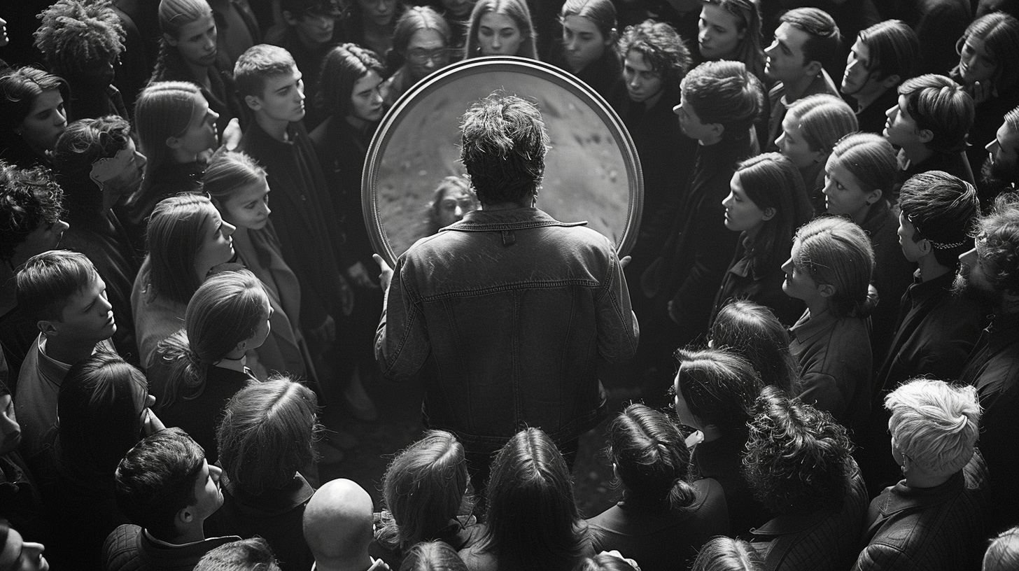 Der Titel „Man in the Mirror“ ist nicht eine Beschreibung oberflächlicher Eitelkeit, sondern die poetische Essenz einer erhabenen spirituellen Hingabe. Es ist der glorreiche Augenblick, in dem die Seele sich von den Lasten des Lebens befreit, um sich einem höheren Zweck zu widmen. In dieser Vision wird das aus sich erwachsen nicht als der schmerzliche Verlust der unbeschwerten Jugend verstanden, sondern als eine triumphale Metamorphose. Die sorglose Unwissenheit weicht einer tiefen, von Demut getragenen Erkenntnis. Die Figuren, die wie in einer Phalanx in Hypnose voranschreiten sind die stummen Solisten eines liturgischen Meisterwerks, dessen Schönheit in der Einheit ihrer Bewegung liegt.
