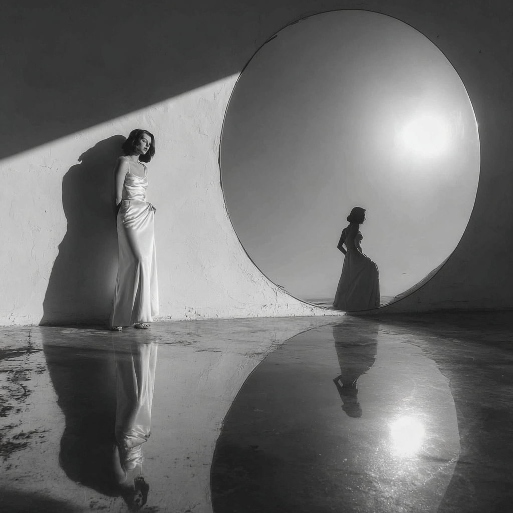 Diese surreale Schwarz-Weiß-Komposition wird zur Metamorphose über die Zyklen der weiblichen Seele. Die Frau im weißen Kleid, deren Schatten sich dramatisch über den Boden erstreckt, steht der kreisrunden Öffnung gegenüber, in der eine andere Gestalt zu knien scheint – wie die beiden Phasen des Mondes, die einander bedingen und ergänzen. Das große, leuchtende Rund wird nicht nur zum Portal zwischen den Welten, sondern zur Verkörperung jener kosmischen Weiblichkeit, die alle Gegensätze in sich vereint.