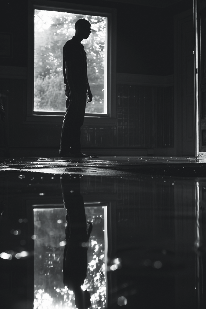 Diese dramatische Schwarz-Weiß-Komposition wird zur Offenbarung über die transformierende Kraft des bewusst angenommenen Schmerzes. Die Silhouette am Fenster, umgeben von den Reflexionen des Lichts im Wasser zu ihren Füßen, verkörpert jene paradoxe Erkenntnis: dass wir oft erst dann zu schwimmen lernen, wenn wir aufhören, gegen die Fluten unseres eigenen Leidens anzukämpfen. Das Licht, das durch das Fenster strömt, wird nicht zur Flucht aus der Dunkelheit, sondern zur Illumination ihrer verborgenen Schönheit.