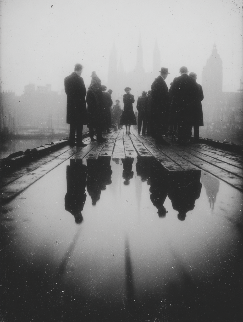 Doch der wahre Horizont liegt nicht in der Ferne, sondern in der spiegelnden Oberfläche unter ihren Füßen. Dort, in diesem trügerischen Spiegel, der die Welt in sich trägt, sehen wir nicht nur die scharfe, unversehrte Reflexion ihrer Macht, sondern auch die unscharfe, nebelhafte Prophezeiung eines Landes, das sie einst raubten. Es ist ein Akt der Selbsterkenntnis, der uns lehrt, dass die erhabene Schönheit des Aufstiegs oft die tragische Wahrheit des Raubes in sich trägt. Und so stehen sie im Morgenlicht, diese Hüter einer neuen Ära, unwissend von der Anbetung des Mammon, die einst die Fundamente der Nation zerbrechen und sie selbst zum Fallen bringen wird. In diesem Bild liegt nicht die Erlösung, sondern die poetische, unausweichliche Prophezeiung eines Schicksals, das sich bereits im Moment seiner größten Pracht zu offenbaren beginnt.