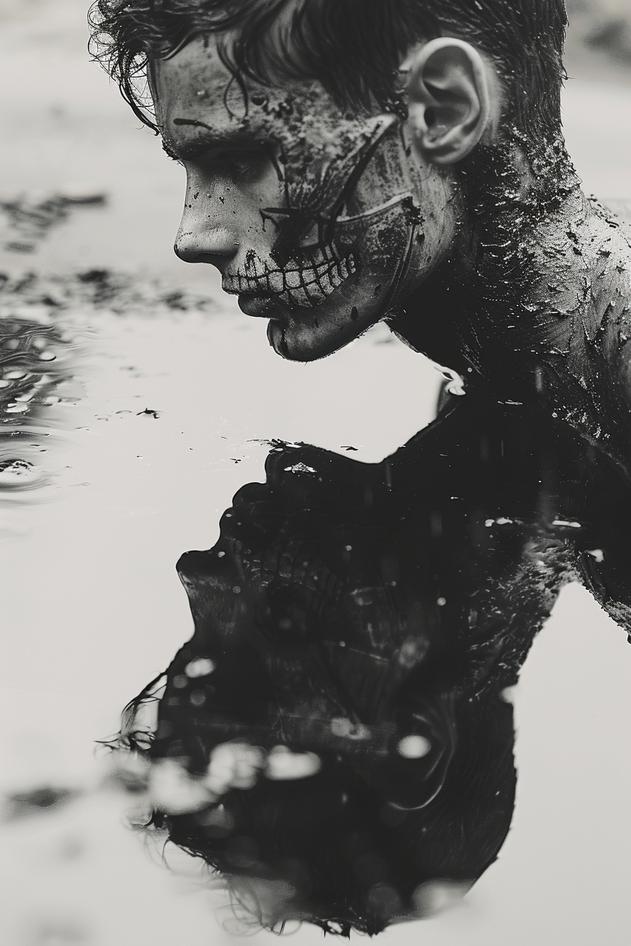 Doch im Spiegel des Wassers, der kein bloßes Abbild, sondern ein Portal in die tiefsten Schichten des Bewusstseins ist, ringt das wahre Selbst um seine Erlösung. Die verzerrte, auf den Kopf gestellte Reflexion ist die unmissverständliche Hoffnung, die sich aus dem Dreck erhebt – die Umrisse eines Ganzen, das einst zerbrochen schien. Es ist der unbeugsame Wille, eine leise, unzerstörbare Kraft, die in diesem Augenblicks des Übergangs die rohe, ungeschönte Wahrheit zu einem Neuanfang macht.