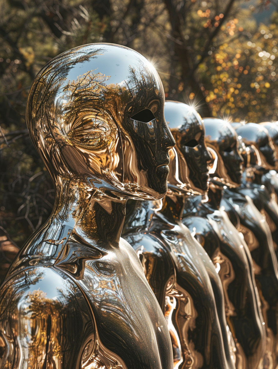 Dies ist die Prozession der seelenlosen Unendlichkeit. Société transhumaniste ist keine bloße Anordnung von Statuen, sondern ein unbarmherziges Orakel, das uns die Verheißung über das Schicksal unserer Zivilisation verkündet. Die marschierende Reihe goldener Doppelgänger, deren makellose, spiegelnde Oberflächen die kalte, unmenschliche Perfektion einer Katastrophe unvorstellbaren Ausmaßes widerspiegeln. Wir blicken nicht auf Körper, sondern auf die Abbilder einer Seele, die ihre Verbindung zur Natur, zu den Ursprüngen und zu sich selbst aufgegeben hat.