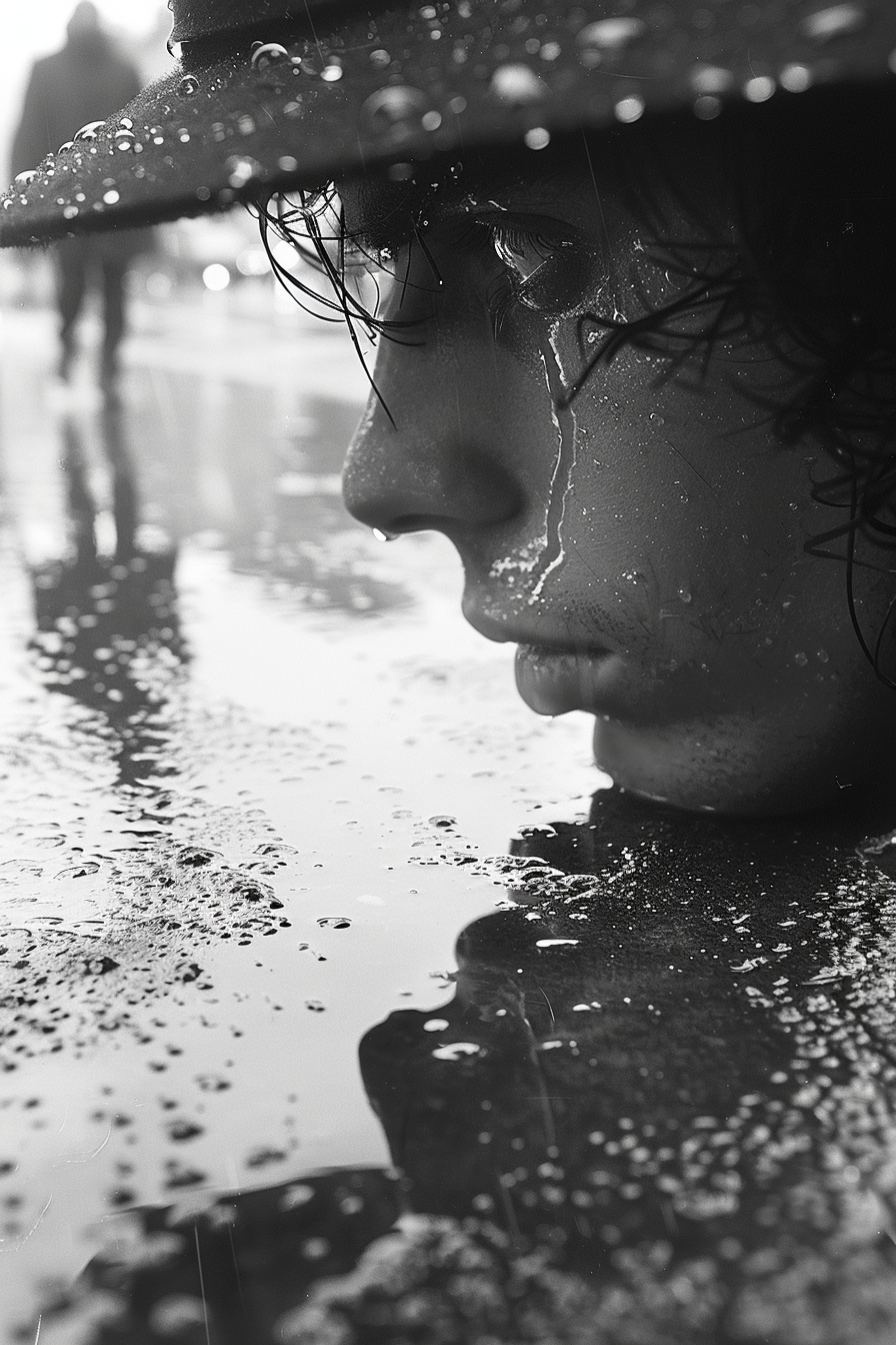 Diese intime Schwarz-Weiß-Explosion wird zur Meditation über die Geburt des Selbst aus dem Nichts. Das Profil, umgeben von den tanzenden Wassertropfen wie Sternen in einer gerade entstehenden Galaxie, verkörpert jenen heiligen Moment der Selbstschöpfung, wo die Seele versteht: Sie ist nicht nur Zeuge des Universums, sondern dessen aktive Mitschöpferin. Jeder Tropfen wird zum Keim einer neuen Welt, jede Reflexion zu einer anderen Dimension des Seins.