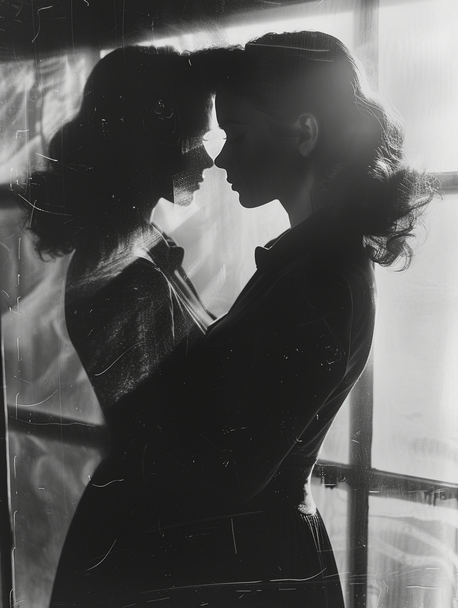 Die vintage Ästhetik des Bildes erinnert daran, dass diese Begegnung zeitlos ist – sie geschieht seit Anbeginn der Menschheit und wird geschehen, solange es Seelen gibt, die sich in der Spiegelung des anderen erkennen. Das diffuse Licht, das die Szene durchflutet, wird zum Symbol jener Erkenntnis, die entsteht, wenn zwei Menschen endlich verstehen: Sie schauen nicht in ein fremdes Gesicht, sondern in den Spiegel ihrer eigenen vervollständigten Natur.