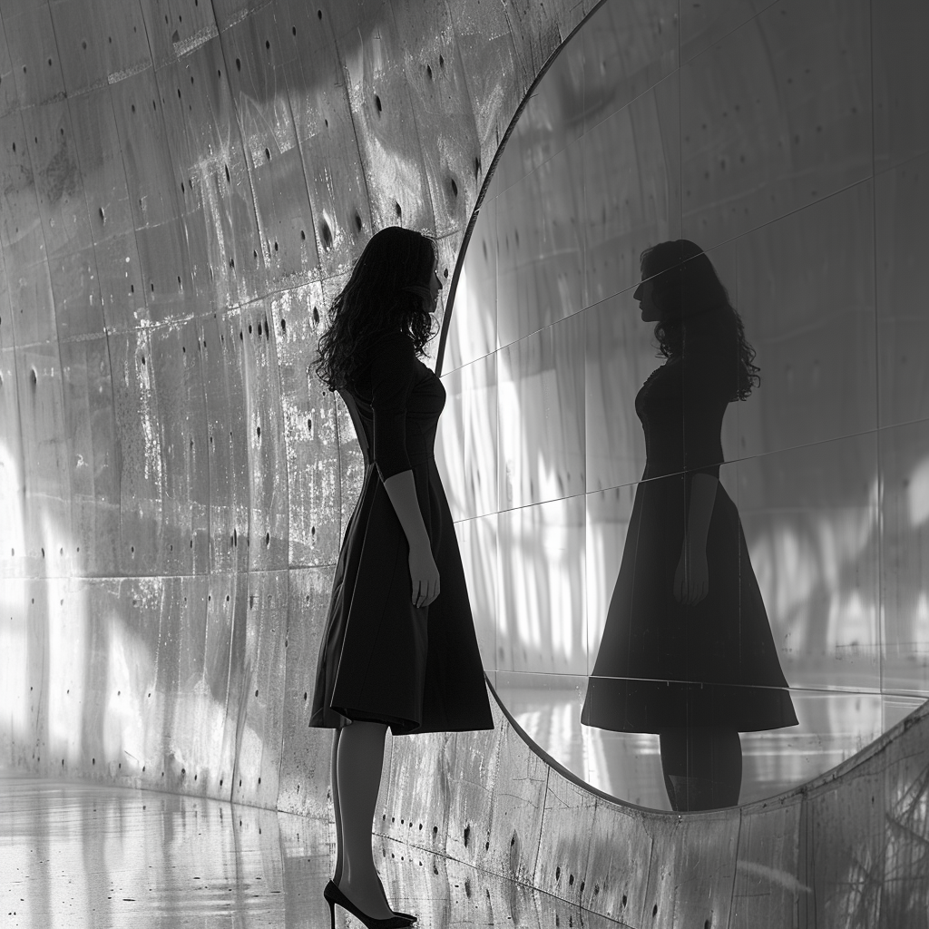 Diese minimalistische Schwarz-Weiß-Architektur wird zur Meditation über die Dualität des Erkennens. Die Gestalt vor dem kreisrunden Spiegel, deren Reflexion eine andere Perspektive zeigt, verkörpert jene fundamentale Wahrheit der Selbsterkenntnis: dass wir immer sowohl der Fragende als auch die Antwort sind, sowohl der Suchende als auch das Gesuchte. Die raue Betonoberfläche mit ihren unzähligen kleinen Löchern wird zur Metapher für das durchlöcherte Wissen – all die Lücken und blinden Flecken, die unser Verstehen prägen.