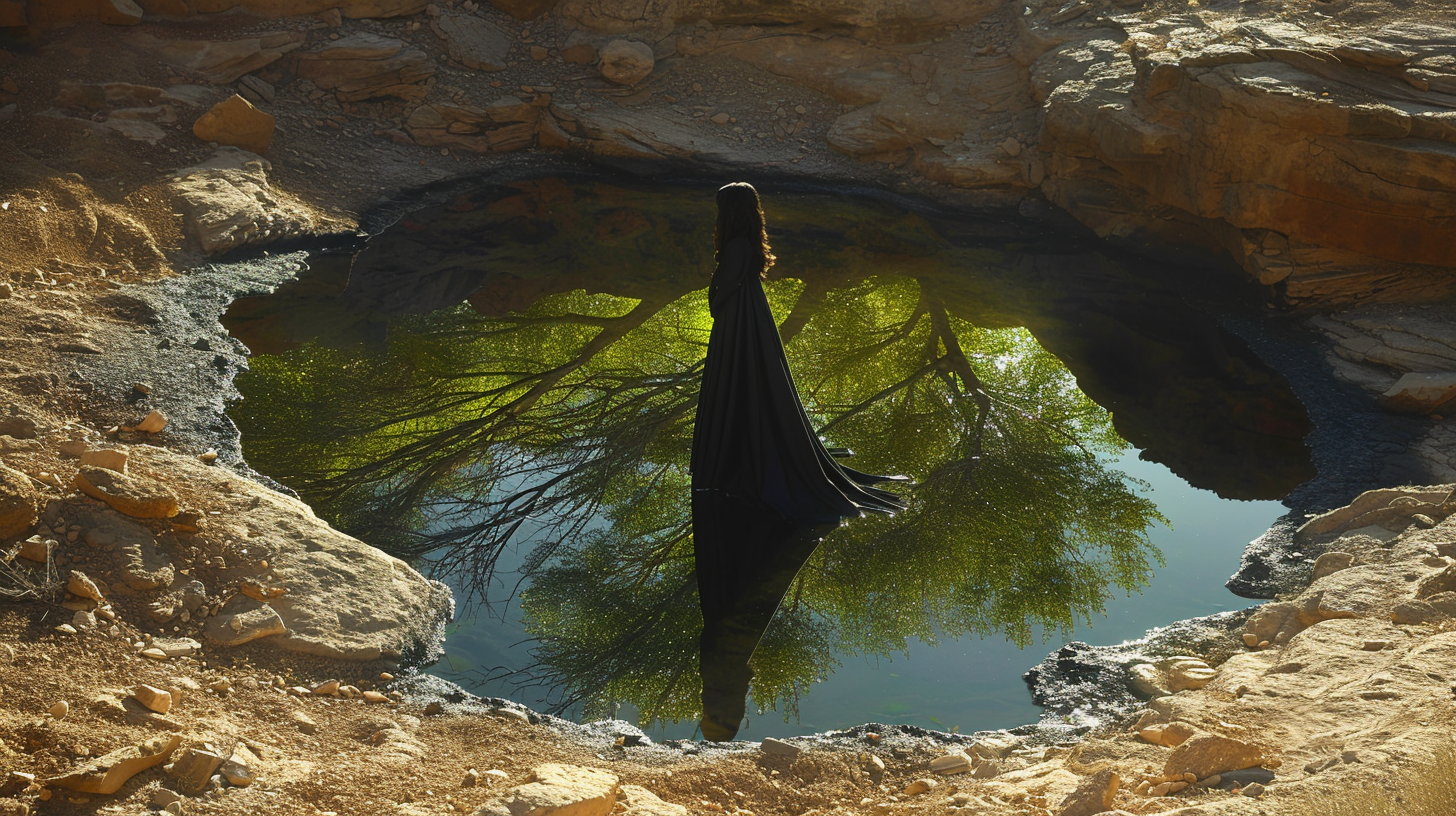 Diese archaische Vision wird zur Meditation über die Rückkehr zu den Quellen des Seins. Die schwarzgekleidete Gestalt am Rand des smaragdgrünen Wassers verkörpert jene seltene Pilgerschaft zu den inneren Landschaften, wo die Seele abseits aller Ablenkungen mit sich selbst in Dialog tritt. Die Reflexion des Baumes im Wasser wird zum Symbol jener Wurzeln, die tief in das Unbewusste reichen und doch ihre Krone im Licht der Bewusstheit entfalten.