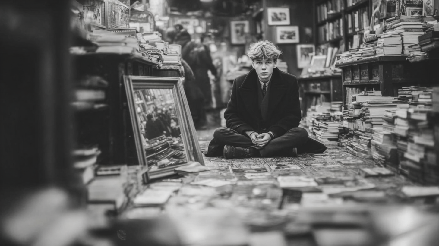 Diese schwarz-weiße Vision wird zur Meditation über die innere Ruhe im äußeren Tumult. Der junge Mann, meditativ sitzend zwischen den Türmen des Wissens und den Spiegeln der Vergangenheit, verkörpert jene seltene Fähigkeit, im Auge des Sturms der Information seine eigene Stimme zu finden. Die unzähligen Bücher um ihn werden nicht zu Lärmquellen, sondern zu stummen Zeugen einer Seele, die gelernt hat, zwischen den Zeilen zu lesen und das Wesentliche vom Nebensächlichen zu unterscheiden.