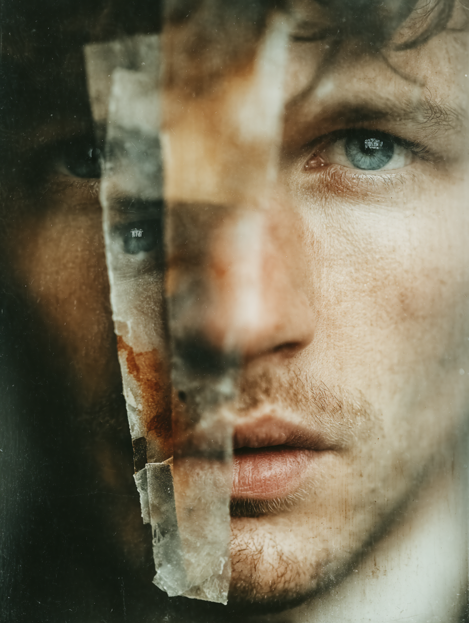 Die Linse blickt in das atemlose Warten einer Seele, deren Antlitz eine zarte, fragile Hülle ist, die vom Schmutz und den Spuren des Leidens gezeichnet ist. Doch die größte Wunde ist nicht die, die man sieht. Sie ist das scharfe Band aus Papier, das den Mund versiegelt und das Auge zerschneidet – ein Symbol der Selbstzensur, die den Blick ins Innere mit Gewalt abwendet. Dahinter, im unscharfen, fast geisterhaften Abbild, liegen die vielen Gesichter, die wir in Umbrarum Murmur sahen, die unzähligen Teile des Selbst, deren stummer Chor des Leidens sich im Inneren verzehrt. Und die Tränen, die über das Antlitz rinnen, sind nicht nur Wasser; sie sind das Salz des Leidens, das die altlast der Scham und der Schuld aus den tiefsten Schichten der Seele spült.