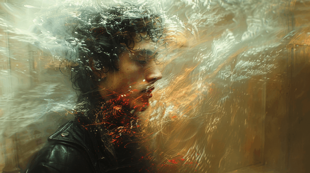 Dieses Bild ist ein Versuch diese expressionistische Metamorphose einzufangen, wo die Seele durch das Chaos ihrer eigenen Auflösung hindurchgeht. Das Gesicht, halb verborgen im Sturm der Bewegung, verkörpert den Menschen im Auge des inneren Hurrikans – dort, wo alle Sicherheiten weggerissen werden und nur noch das Wesentliche bleibt. Die wirbelnden Elemente um das Antlitz werden zu den Kräften der Reinigung, die alles Überflüssige fortspülen.