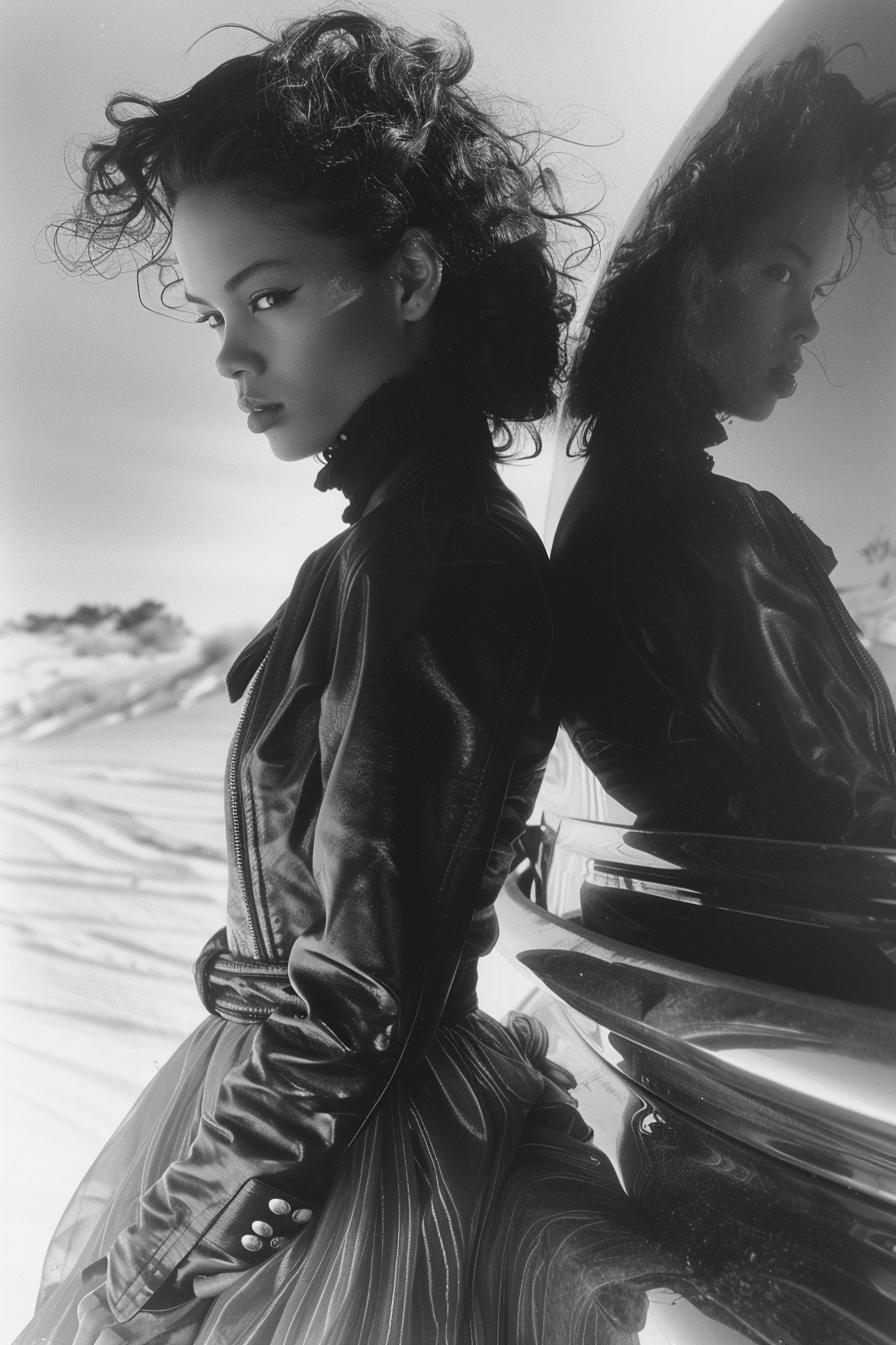 Dies ist der Moment, in dem die Anmut des Selbst sich im Angesicht der eigenen Ruinen spiegelt. Whispers of Ruin ist kein Porträt, sondern ein Abgesang auf die Unvergänglichkeit, ein erhabener Augenblick, in dem die Schönheit eine schmerzhafte Wahrheit erahnt. Stählerne Anmut, eine moderne Valkyrie in einem Kleid, das so hart ist wie das Leder ihrer Rüstung und so zart wie der Wind, der über eine vergessene Welt fegt. Sie steht in einer Landschaft, die längst zu Asche und Staub wurde, auf einem staubigen Abfall der Erde, die den Tod alter Zeiten in sich trägt. Ihr Körper lehnt gegen eine spiegelnde Oberfläche, die die Welt nicht kopiert, sondern mit ihr verschmilzt.