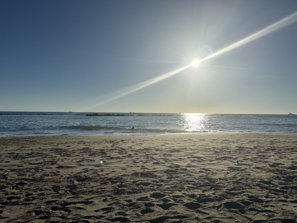 Ich zog meine Sandalen aus – diese treuen Begleiter, die meinen Füßen so viel zugemutet hatten – und spürte den kalten Sand unter meinen Füßen. Ein Segen. Nach Kilometern auf Asphalt, auf Geröll, auf Waldwegen – nun dieser feine, kühle Sand, der sich zwischen die Zehen schmiegt wie eine Umarmung von unten.