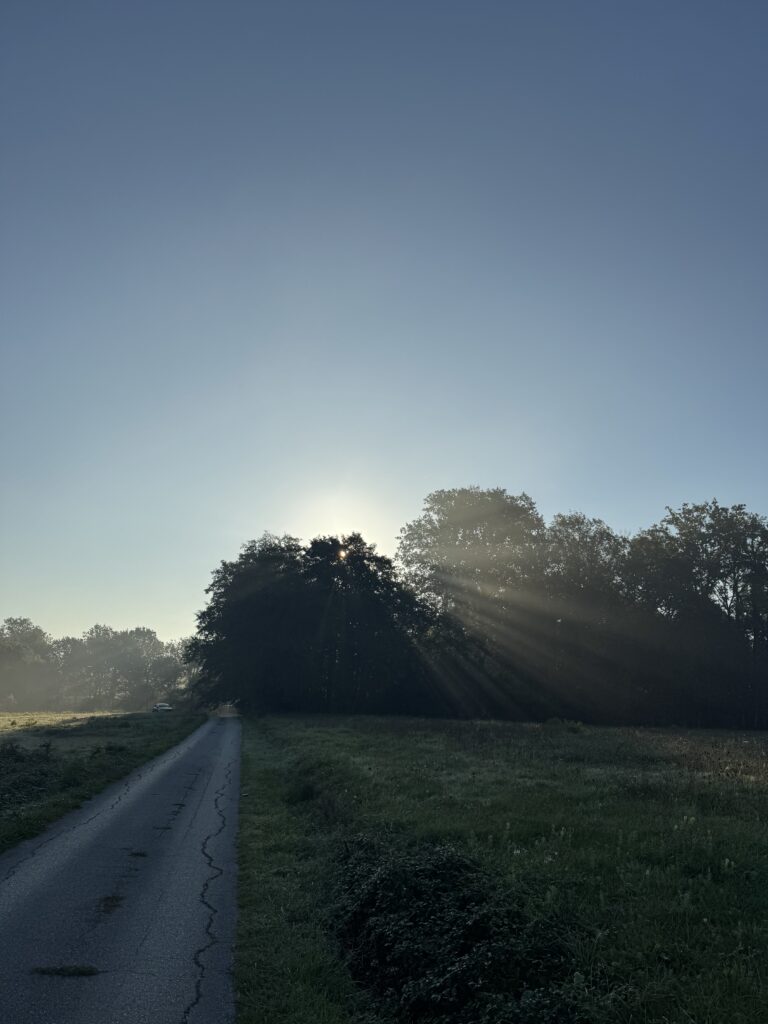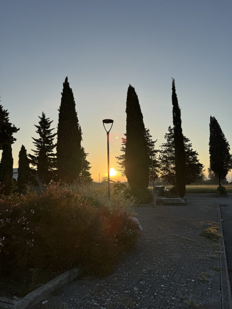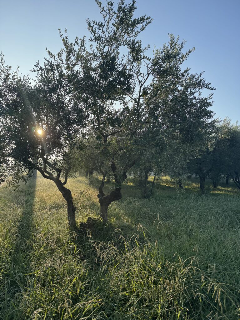 Das Silber des Taus auf den Gräsern. Das Gold der ersten Sonnenstrahlen, die durch die Olivenbäume brechen. Das tiefe Grün der Hügel, die sich im Nebel verlieren. Das Rosa des Himmels, der noch nicht ganz wach ist.