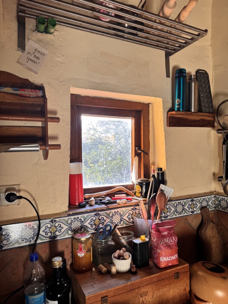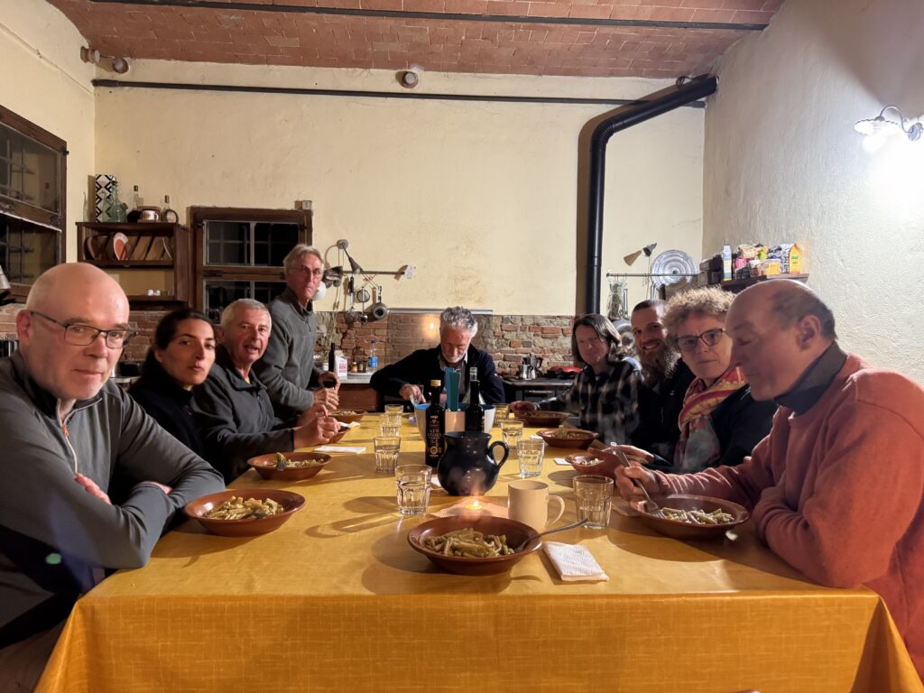 Wir sitzen alle zusammen. Kyle, Ignazio, die anderen Pilger. Wir reden. Wir lachen. Wir teilen das Brot. Das Essen schmeckt nicht nur nach Nudeln und Tomaten, sondern nach Zugehörigkeit. Nach Heimat. Nach Leben.